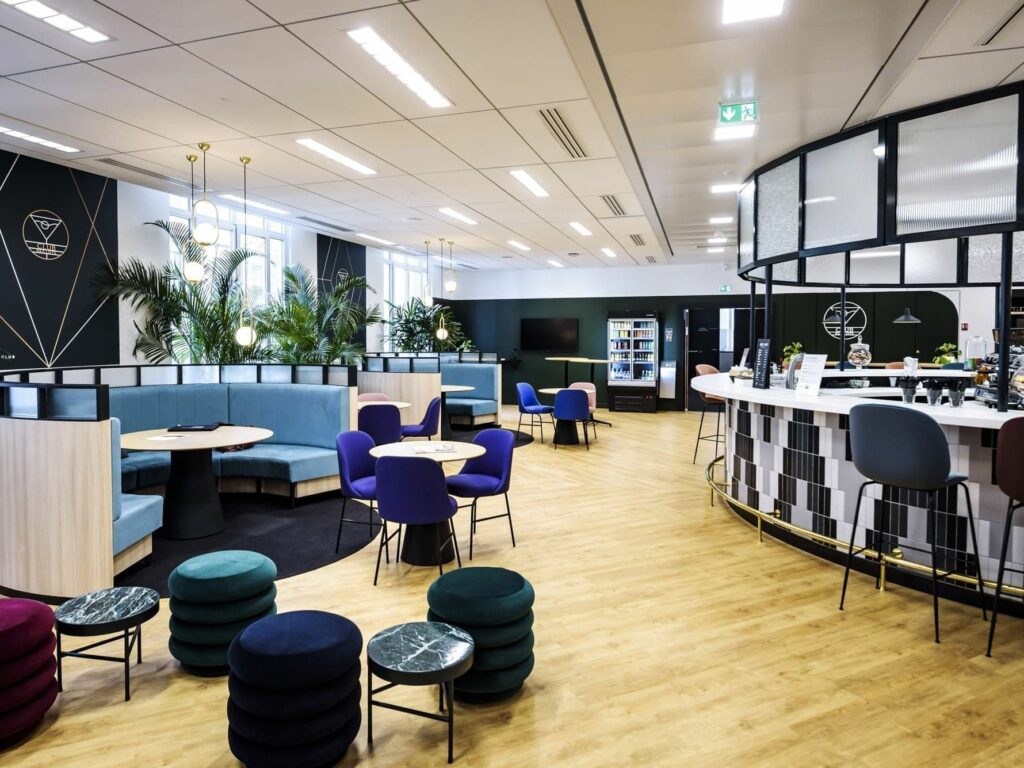 Espace « Paillote Blanche » : Des tables mange-debout, panneaux gainés façon chevron. Intégrations de trois alcôves en gainage tissu et dossier toute hauteur façon tuyau d’orge. Plan de travail stratifié, habillages mauraux stratifiés à bandes verticales traitées façon grain d’orge.