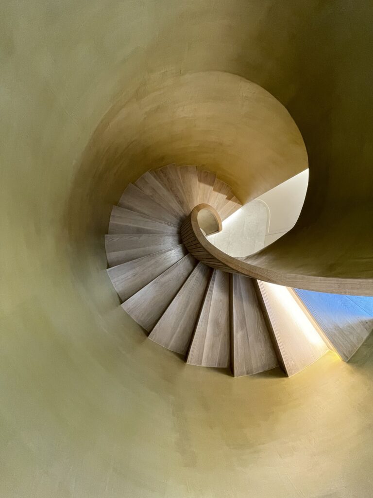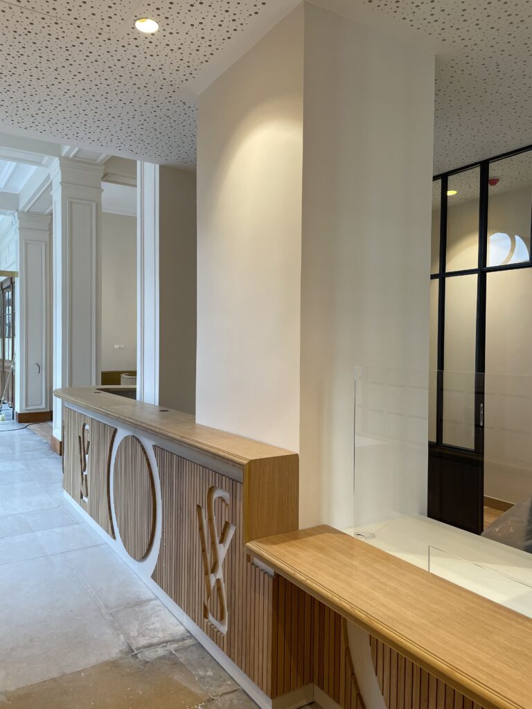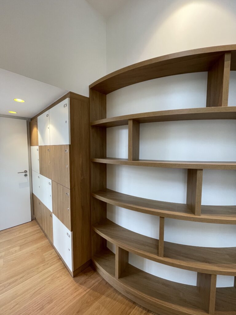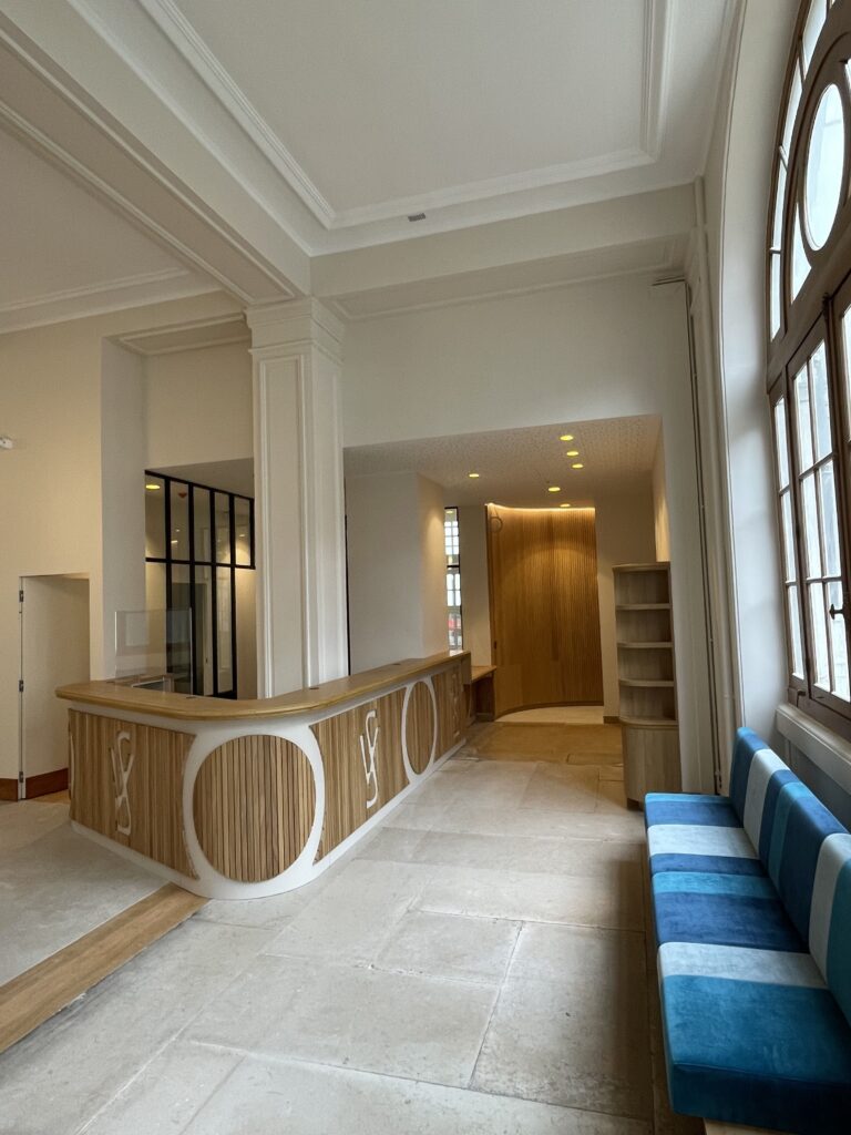 Le mobilier, entièrement fabriqué sur mesure au sein des ateliers de production, a été conçu spécifiquement pour les espaces d’accueil et la salle de réunion, alliant élégance et fonctionnalité. L’intervention s’est conclue par la conception et l’installation d’un escalier circulaire sur mesure.