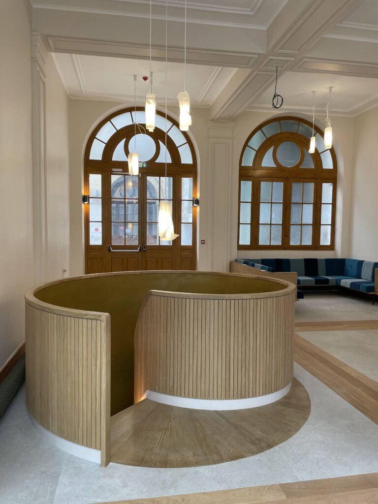 Grizard Agencement a réalisé la rénovation de l’accueil-porterie et la création d’un espace Forum, dans un environnement occupé.