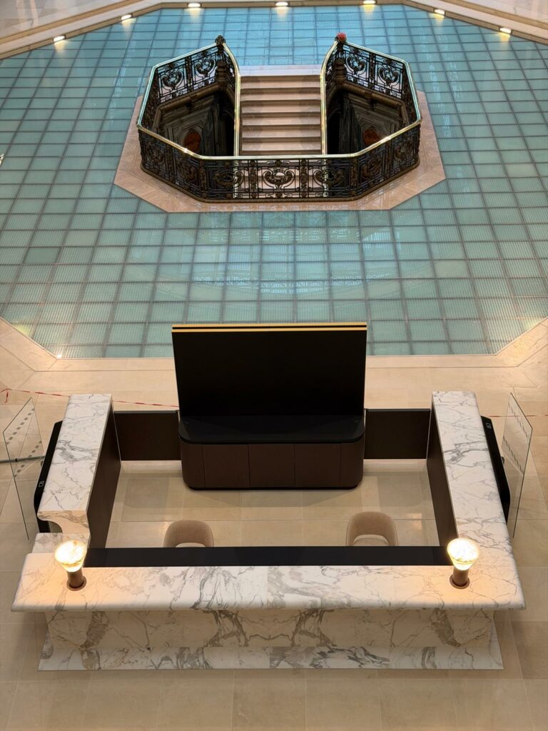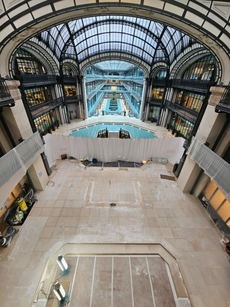 Grizard Agencement est intervenu sur ce projet mené en plusieurs phases, comprenant le curage et la démolition, l’installation de chantier, puis la réalisation et la pose d’une banque d’accueil en marbre. L’entreprise a également assuré l’aménagement des paliers des différents étages, les travaux de plâtrerie, peinture et habillages muraux, ainsi que la pose de revêtements de sol en pierre.