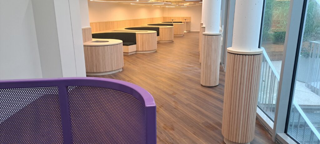 Grizard Agencement a réalisé des gradins avec garde-corps en acier thermolaqué, des mobiliers sur mesure dédiés à des espaces à thème, la mise en œuvre de panneaux acoustiques à déformation 3D, ainsi que l’habillage de piliers en baguettes verticales demi-rondes en érable.