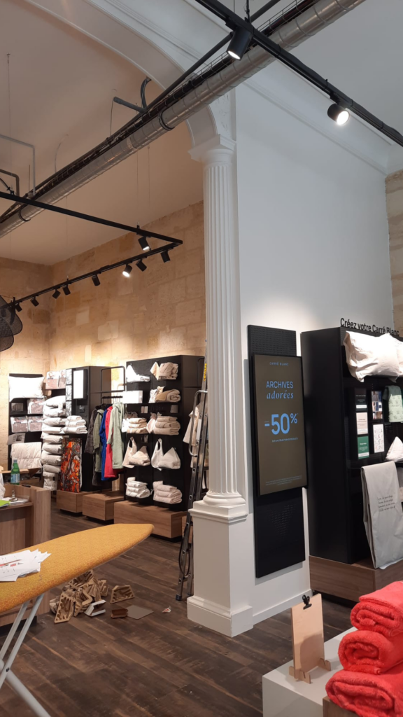 Mise en œuvre du nouveau concept Carré Blanc, démolition et curage, cloison, électricité (CFO/CFA), préservation de l’existant, menuiserie, création de sanitaire, peinture et pose des sols ainsi que du faux plafond. Façade et pose de vitrines, fourniture et pose du mobilier.