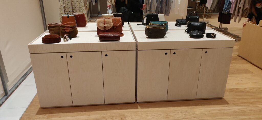 Ensemble habillage poteaux (chêne et laqué avec intégration de miroirs), ensemble mobilier, aménagement pôle cabine, charpente, portant sur-mesure en inox.
