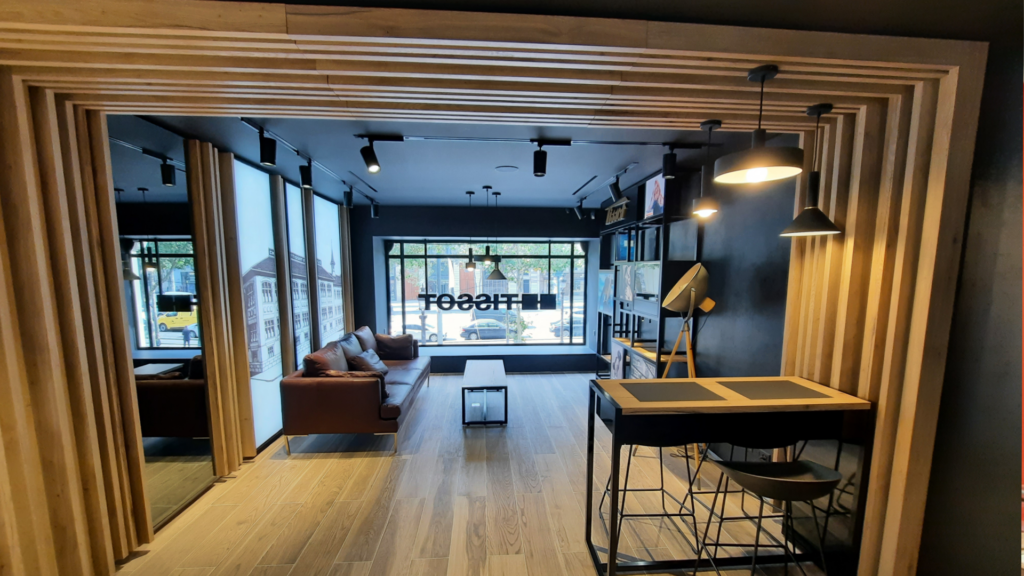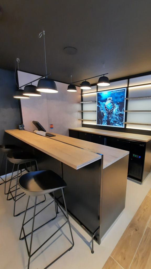 Dépose et évacuation de l’ancien mobilier, façade complète, agencement muraux, fabrication et pose de mobilier sur-mesure.